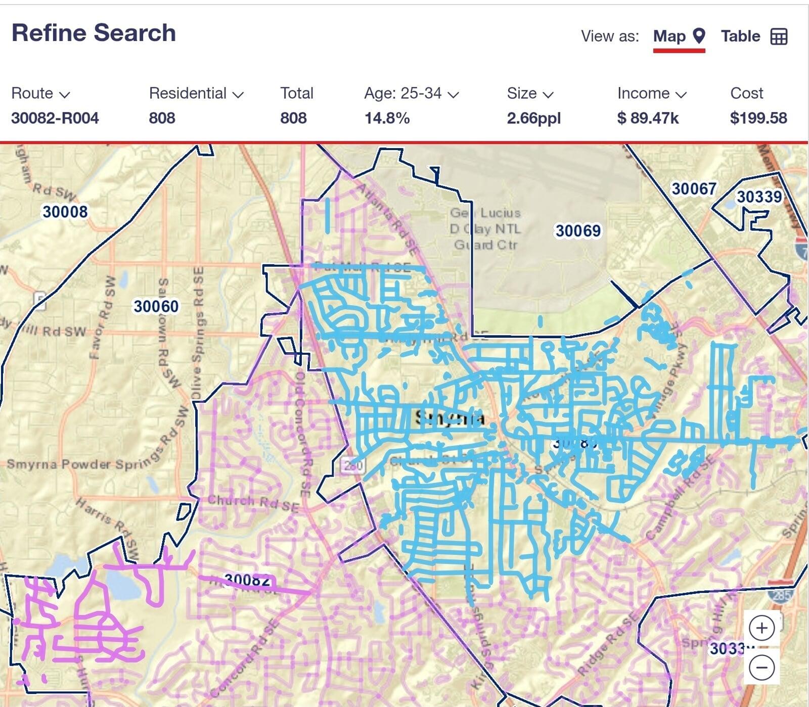 | EDDM ROUTE # | # OF RESIDENCES | FAMILY SIZE | AVERAGE INCOME | |